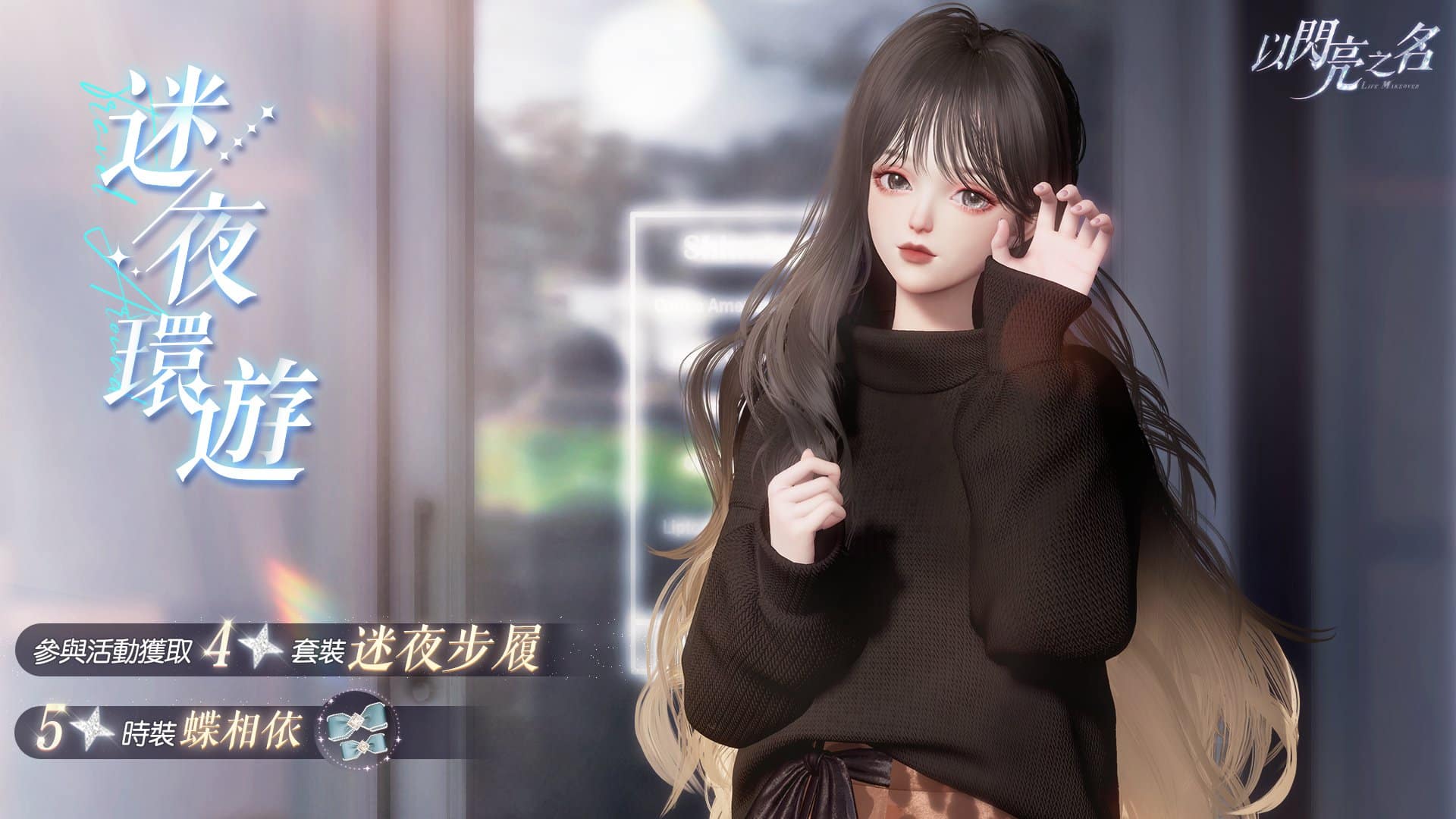 迷夜之中遊走市街,為設計風格增添靈感。每日活躍可獲取骰子,在地圖中累積環遊積分,可以獲取四星【迷夜步履】套裝、【愛意永恆】拍照萌拍、璀璨邀請函及多種材料道具。在活動最後三天,更會每日奉上紀念禮包,包括五星【蝶相依】時裝、【夏日頌歌】拍照相框等禮。