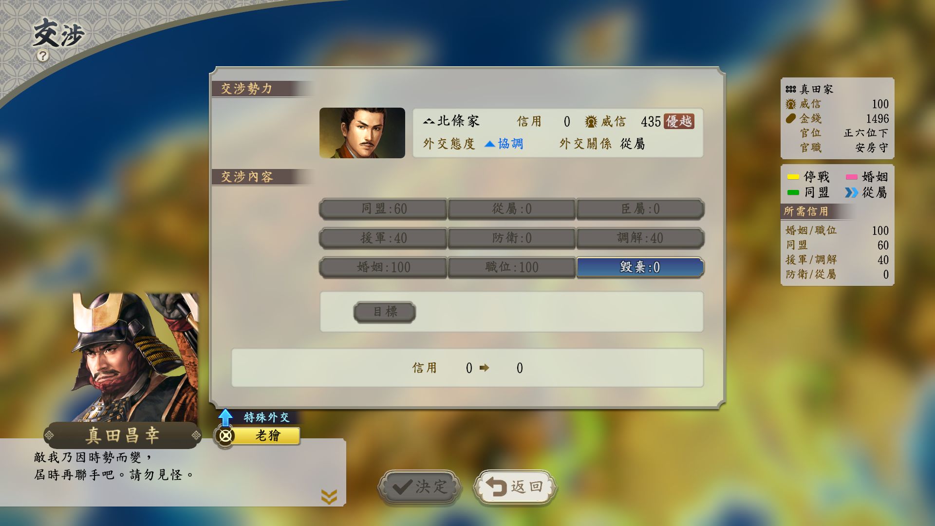 此事件的歷史背景乃是真田昌幸的專屬特性「老獪」的典故的原型,而「老獪」的特性將可以使「讓因撕毀同盟導致的外交態度惡化與忠誠下降無效」,而對外交產生有益的效果,而會戰時的專屬戰法「表裡比興」則是會使與昌幸交戰的敵方部隊陷入混亂,同時防禦也遭弱化的優秀戰法。