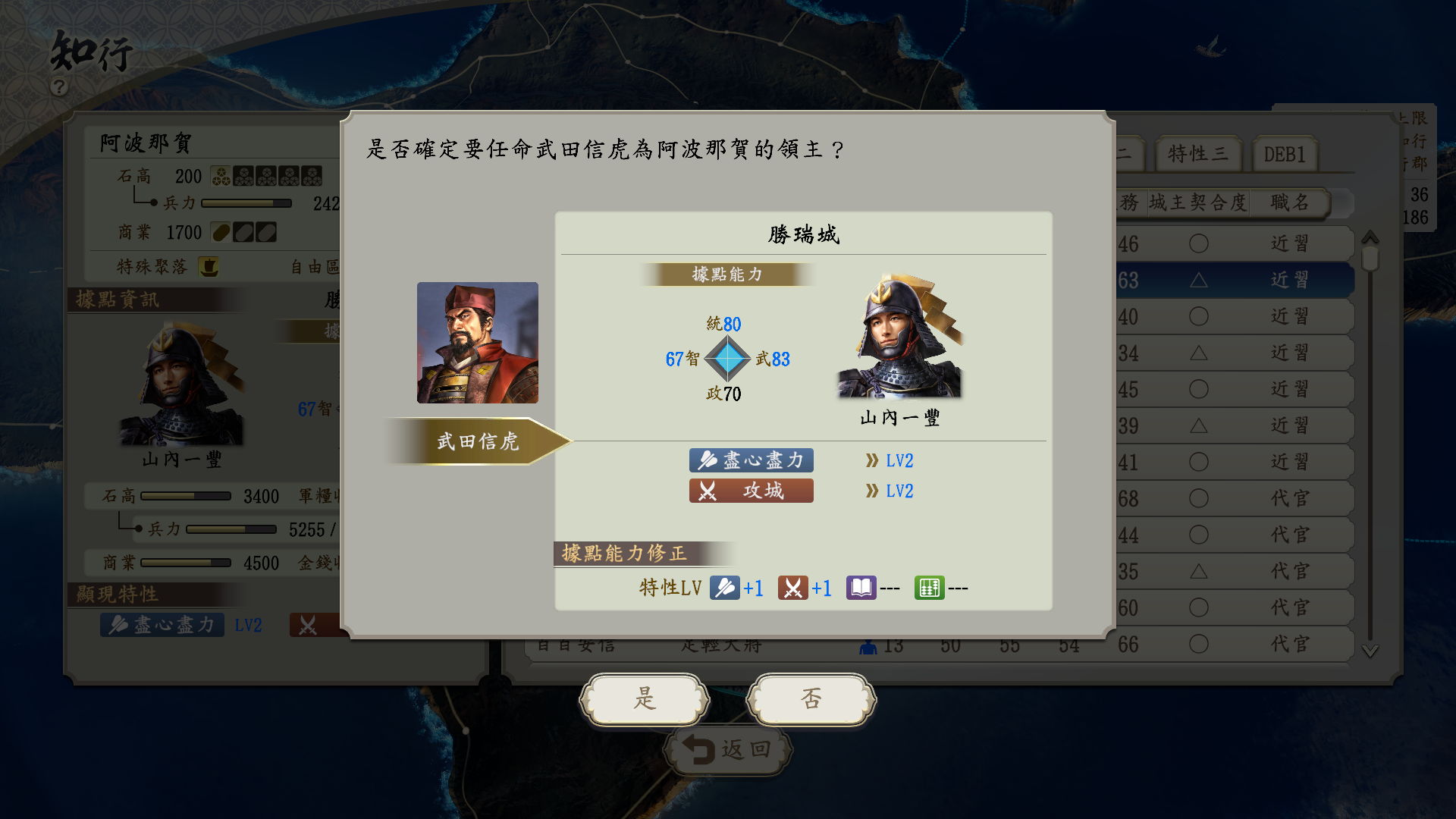 於接近敵人的據點配置擅長戰鬥的家臣來強化軍事面,而在後方的據點則配置長於內政的家臣,在上述戰略考量下,也可透過不同的武將組合來強化能力,補足城主的弱點部分,因此將有無限的方式來思考如何安排人才的配置。