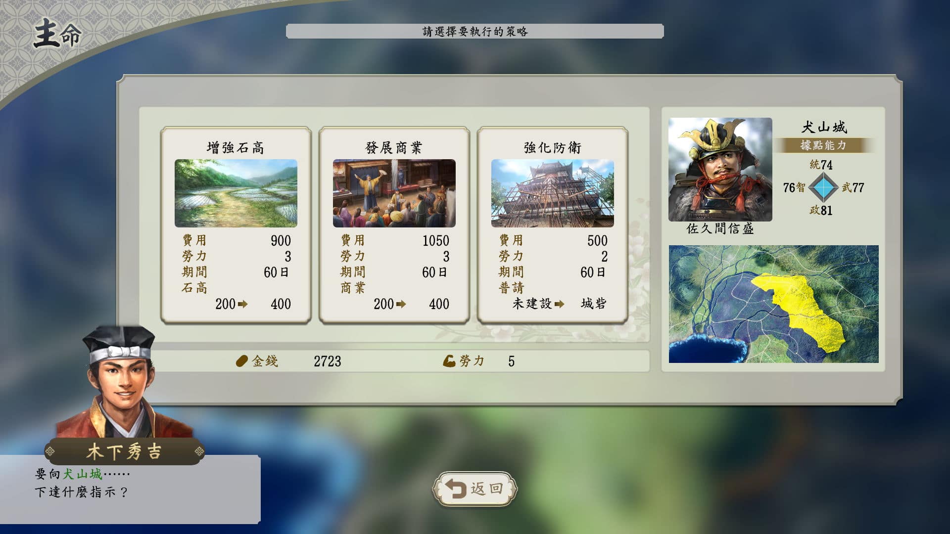 此外還有可指示進行據點強化及對敵據點謀略的「主命」。透過據點強化將使家臣遵循所指示的方針來強化內政,而指示進行謀略則將對敵勢力的據點進行妨礙工作。
