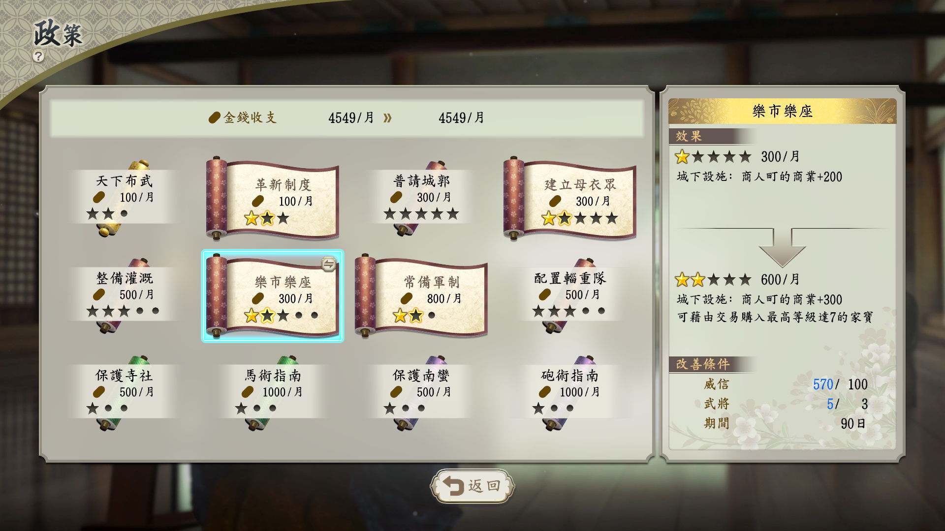 隨著據點強化並擴大勢力後,便可能與比自勢力更強大的勢力對抗,然而強化據點終究有其極限,因此為了對抗比自己強大的勢力,便有必要執行能夠對勢力整體帶來重大效果的政策,以求大幅強化勢力,然而由於執行政策需要穩定的財力及威信,因此在適當的時機推行適當的政策將變得十分重要。