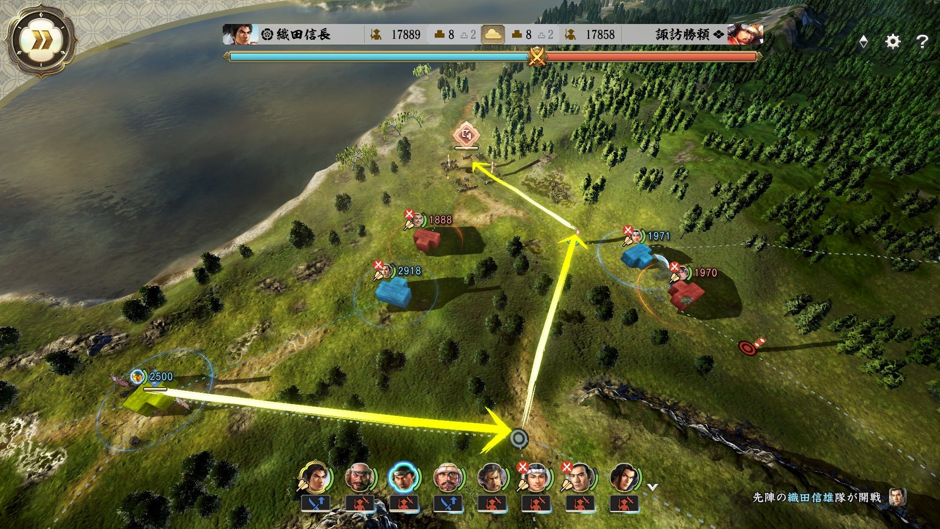 當玩家下達出陣命令後,由城主們率領的各個部隊將一邊攻略敵方領地,一邊朝目標的敵方據點進軍。進軍過程中各個部隊會根據盟友狀態與周圍情況進行獨立的判斷,互相配合,調整進軍路線,決定出擊時機等。