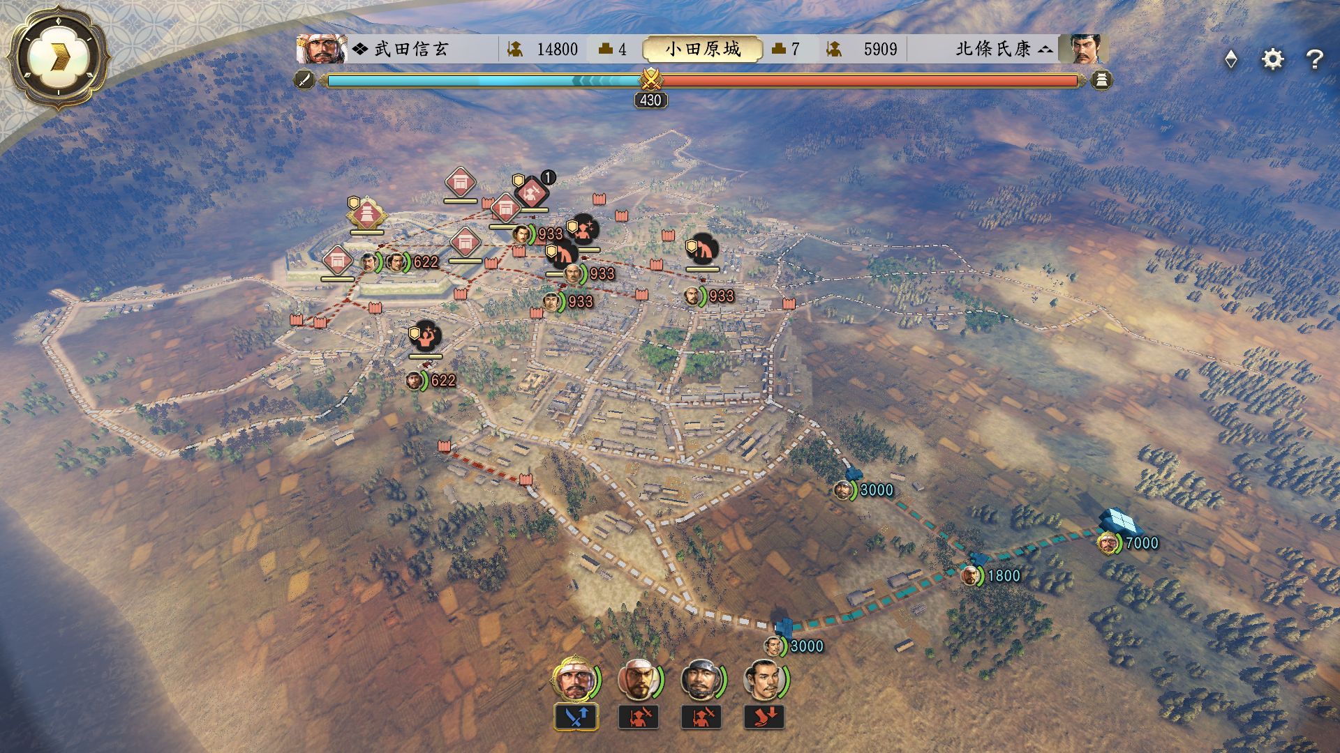 攻城方的總士氣會隨著時間減少,並會隨著攻陷部隊或破壞設施而變動,因此攻城方必須一邊留意總士氣一邊把握時間迅速進攻。此外,若部隊的隨身糧不足,就會以士氣低落的狀態進入攻城戰,因此進入攻城戰前的準備也非常重要。