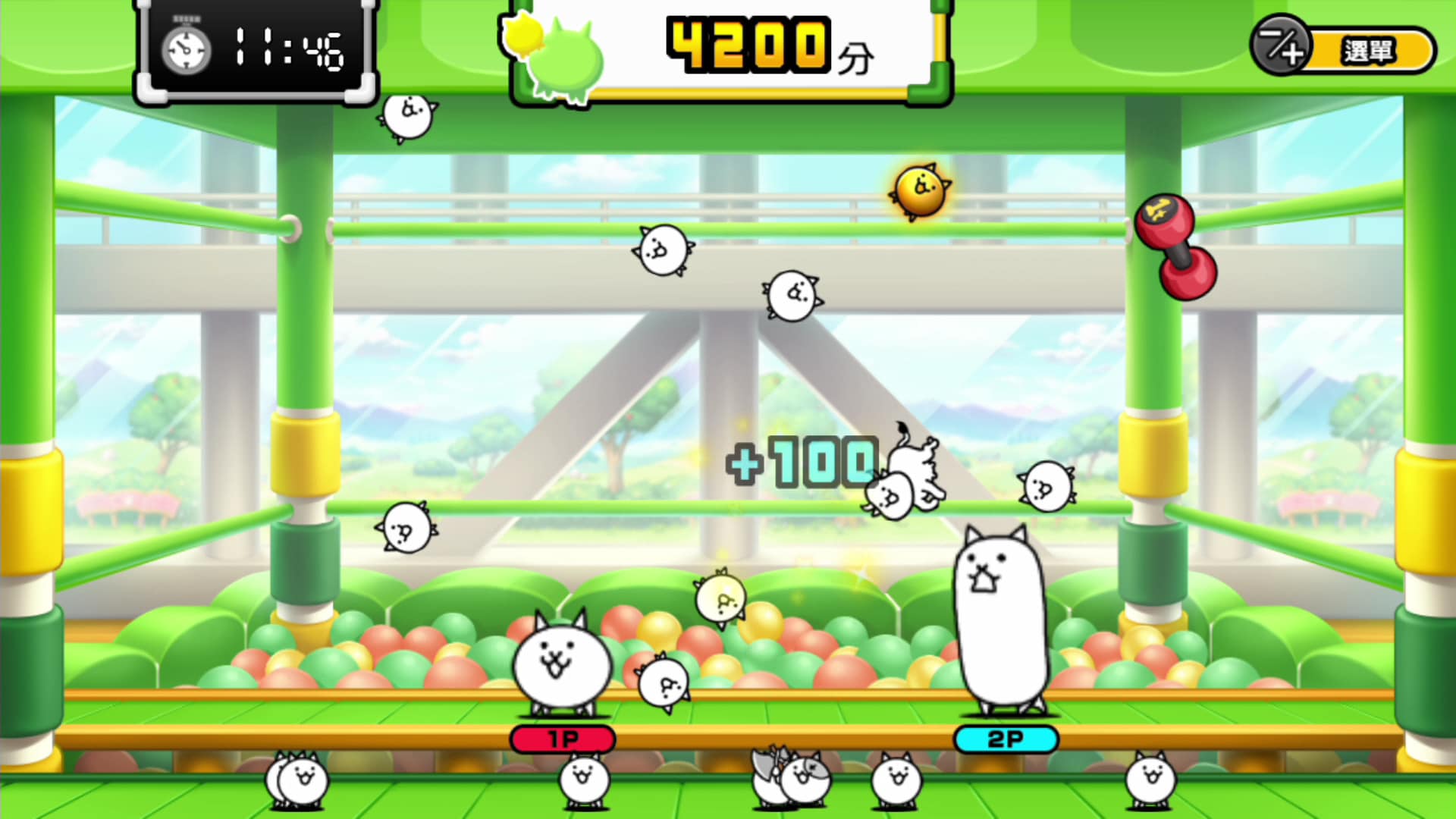 ③ 抓夾大作戰︰抓取從上方掉落下來的貓咪們,越多則得分越高。撞到鐵啞鈴會停止動作一段時間,所以要盡可能地躲避它。