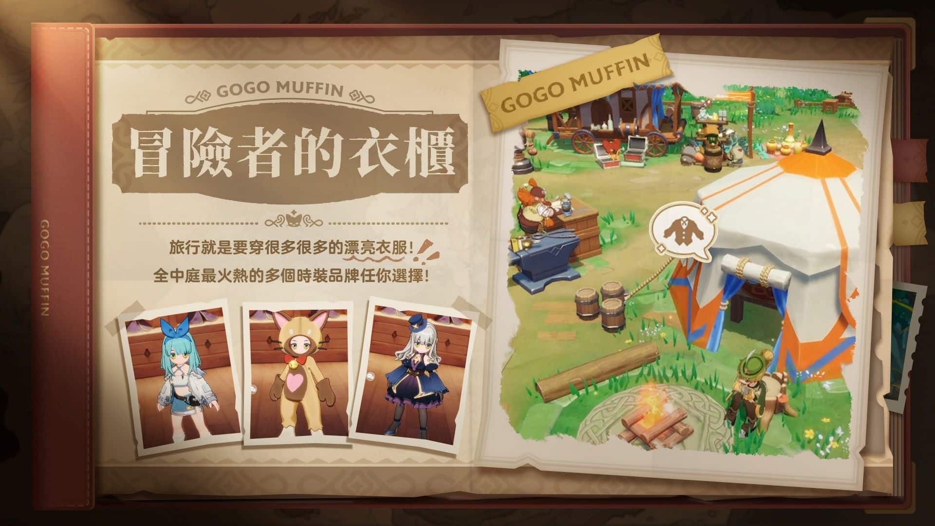 《出發吧麥芬》的時裝系統多彩多樣,從衣服、鞋子、帽子到武器、尾巴、翅膀,甚至連足跡都可以客製化進行換裝,特殊時裝更能根據自己的喜好變換顏色,喜愛紙娃娃系統的玩家絕對會在營地帳篷內照鏡子搭配一整天。官方表示,遊戲中收錄數十套的外觀裝扮,將提供玩家們十足自由的穿搭舞台。