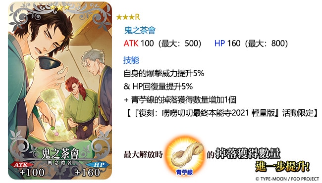 想有效提升「復刻:全體信長總進擊 嘮嘮叨叨最終本能寺 2021 輕量版」的活動道具掉落數量,可以裝備「★5(SSR)群雄割據」、「★4(SR)軍神」及「★3(R)鬼之茶會」進行過關。