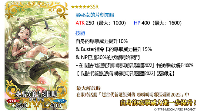 在「超古代新選組列傳 嘮嘮叨叨邪馬臺國 2022」舉辦期間,友情點數召喚卡池將限時變為「限時嘮嘮叨叨邪馬臺國 2022 友情點數召喚」,並實裝全新從者「★1(C)織田信勝」,還有能夠大幅強化概念禮裝的 EXP 卡「★4(SR)概念禮裝 EXP 卡:歡迎來到邪馬臺國!」及「★3(R)概念禮裝 EXP 卡:猛者與無敵」。