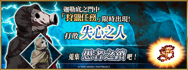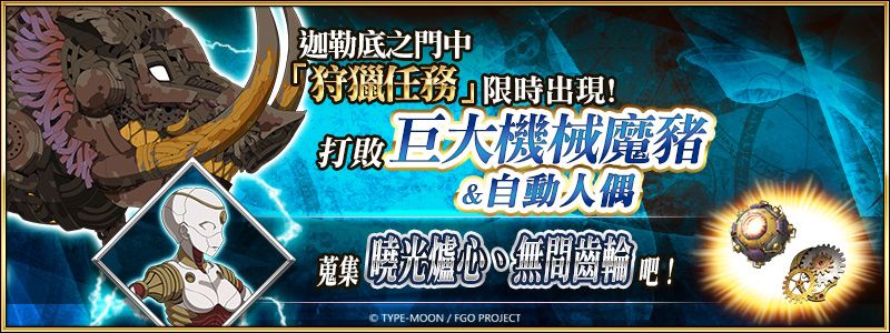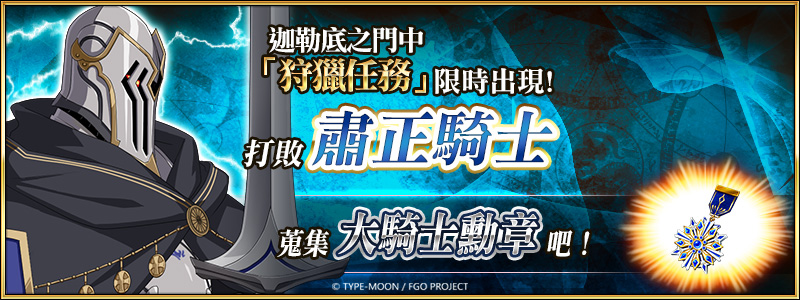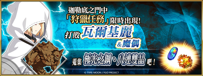 同樣限時開啟的「狩獵任務 第 9 彈」,期間前往迦勒底之門,可以挑戰依次出現各種特定怪物的狩獵任務,每個任務設定有四種難度(包含「狩獵任務 第 8 彈」登場的「典位 + 級」),透過反覆無限次的挑戰,可以獲取技能強化及靈基再臨素材。