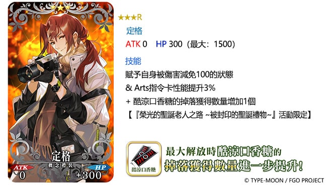 探索現正舉辦的「榮光的聖誕老人之路 被封印的聖誕禮物」時,裝備「2022 聖誕節 PICK UP 召喚(每日變更)」開放的「★5(SSR)閃耀之星」、「★4(SR)赤紅拳擊」及「★3(R)定格」等三款概念禮裝過關「榮光的聖誕老人之路 被封印的聖誕禮物」,除了擁有既有的強化效果,還能有效提升機率掉落的「神聖香蕉」、「聖人能量棒」及「酷涼口香糖」等活動道具數量。
