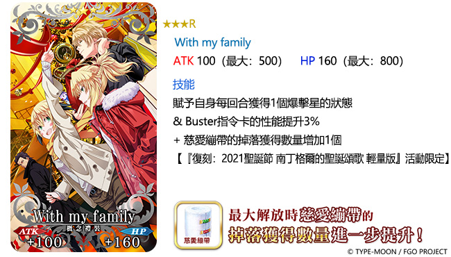 期間登場的,更有「★5(SSR)少女們的午餐」、「★4(SR)情感配送員」及「★3(R)With my family」等三款概念禮裝。當裝備上述禮裝通過「復刻:2021 聖誕節 南丁格爾的聖誕頌歌 輕量版」,除了賦予禮裝既有的增益效果,將有效提升「真心之枕」、「奉獻體溫計」及「慈愛繃帶」等活動道具的掉落數量。