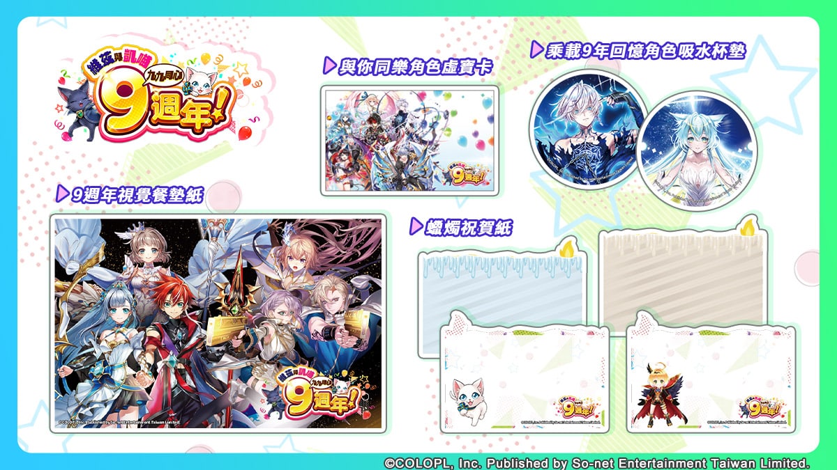 週年慶祝怎麼可以沒有蛋糕,店內特別打造立體「九週年蛋糕祝賀牆」,讓玩家們留下對《黑貓》與《白貓》的祝福。另外,現場除了準備「拍照手拿牌」讓玩家一圓化身精靈夢外,每個座位還有不同角色桌牌陪大家享用「9 週年限定餐點」。