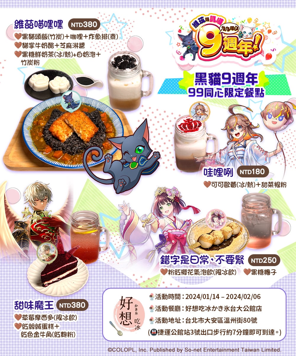 為歡慶《問答 RPG 魔法使與黑貓維茲》中文版迎來九週年,特地攜手《白貓 Project》舉辦雙貓限定合作,1 月 14 日至 2 月 6 日正式登陸「好想吃冰 公館店」。活動期間推出「週年限定餐點」,隨餐附贈多樣 9 週年限定紀念週邊,同時還有一番賞、線上活動等抽。