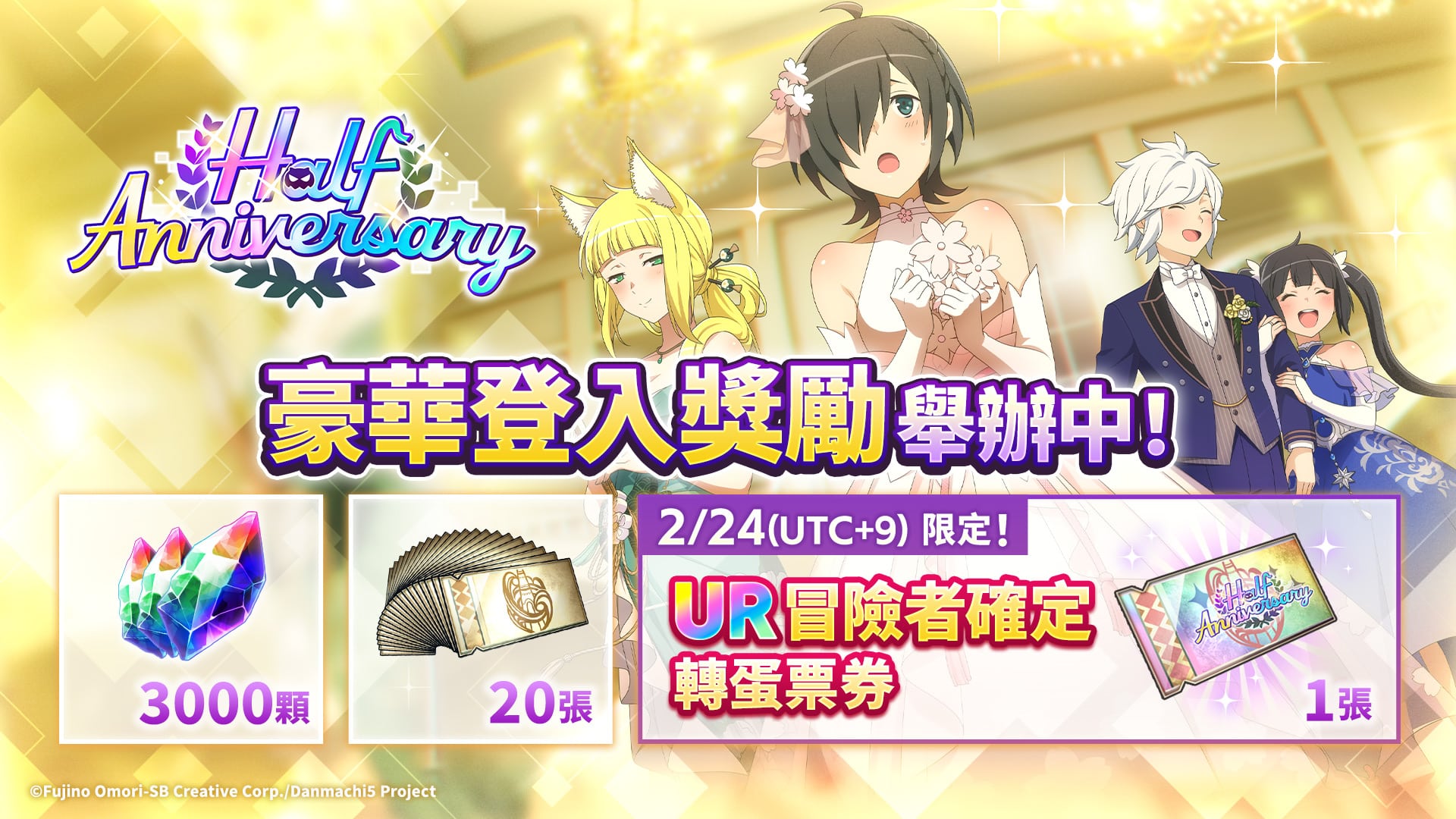 ① 可獲得 UR 冒險者必出轉蛋票券及半周年紀念插圖場景卡片交換票券之登入獎勵,活動期間首次登入即可獲得 3000 顆魔寶石,還有其他紀念場景卡片等超值登入獎勵。此外,在 2 月 24 日當天,還可以獲得 UR 冒險者必出轉蛋票券。