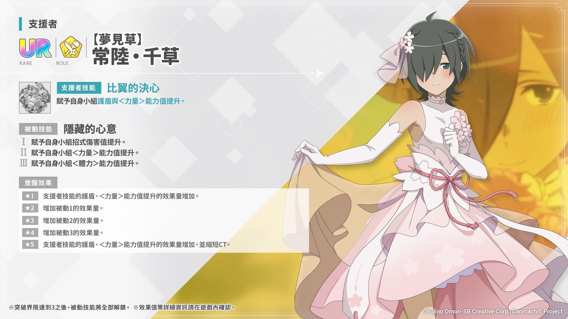 並推出可獲得於「櫻花綻放的慶典之夜」中登場的晚禮服打扮的貝爾與禮服姿態的千草等角色的精選轉蛋。也會販售能以更超值的價格抽取該角色精選轉蛋的轉蛋票券禮包。「【兔子舞蹈】貝爾・克朗尼」是擁有能夠給予敵人超特大傷害,賦予自身小組招式蓄積時間縮短必殺技的冒險者。「【夢見草】常陸・千草」是擁有能賦予自身小組護盾和〈力量〉能力值提升效果的技能的支援者。