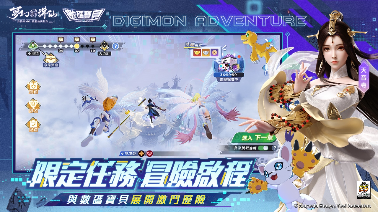 為歡慶《夢幻新誅仙》與《數碼寶貝》合作,即日起玩家只需在活動期間登入遊戲即可獲得聯動限定表情包、幻獸刮刮樂及神鑄令等虛寶獎勵。此外,限定特別任務也將限時開啟,玩家將組成五人小隊,完成各項任務並達成特定條件,即可全隊獲得限定虛寶。全新穿破黑暗玩法同步推出,玩家可同時操控五隻靈獸,根據戰況靈活的排兵佈陣,帶給玩家全新的戰鬥體驗。