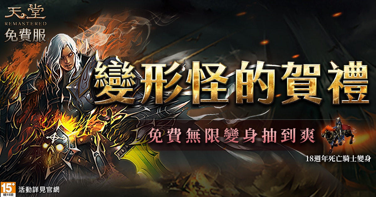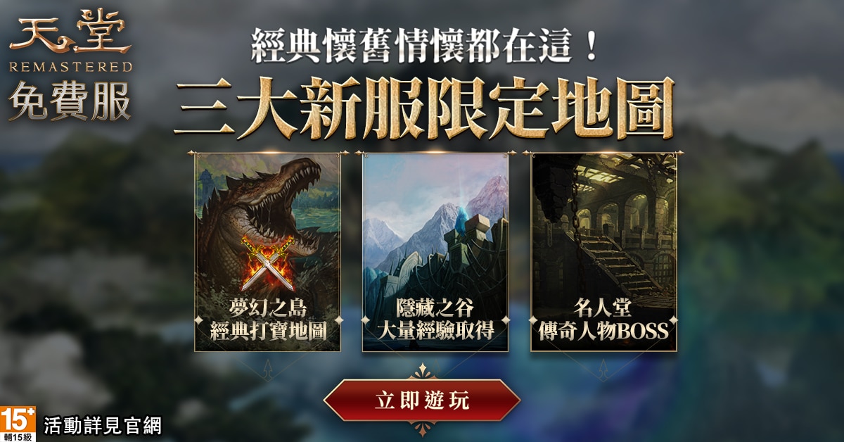 由遊戲橘子代理韓國遊戲廠 NCSOFT 開發的《天堂》免費服 REMASTERED 版本,全新打寶伺服器「遺忘之島」開服。主打免費狂炸百萬虛寶,除有機會免費取得過往僅能在商城購買的裝備,指定條件下還能享有道具掉落率提升 300%、雙倍經驗值。而全新伺服器也復刻三大經典懷舊地圖「夢幻之島」、「隱藏之谷」、「名人堂」,還祭出變形怪的賀禮:「經典變身」無限次免費抽到爽。