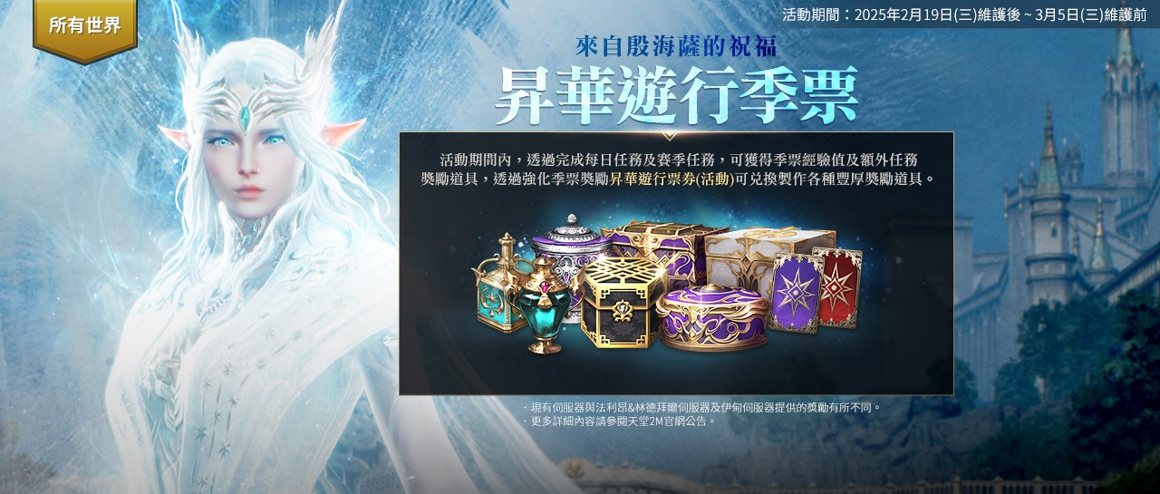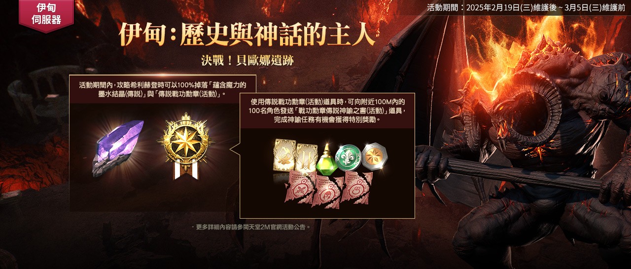 NC 旗下手遊《天堂 2M》更新,原始世界現有伺服器「傑帕爾殿堂」翻新、「獅子王要塞」新增首領「狂氣德拉格」;法利昂與林德拜爾伺服器新增「回歸王峽谷」、狂氣首領、肩甲欄位、工匠製作系統;保值世界伊甸伺服器則新增世界伺服器貝歐娜遺跡、新增大劍職業、所有傳說職業。各伺服器同步展開活動。