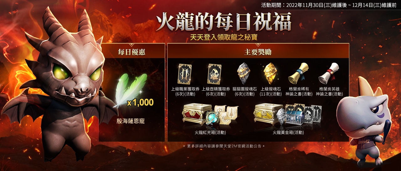 NCSOFT 旗下手遊《天堂 2M》更新,新增亞丁領地新獵場「火龍的痕跡」以及「火龍巢穴」。官方網站也公開了 12 月 14 日改版內容介紹,包含全新「魔法炮」職業、新伺服器「法利昂」、第一個超越合成神話職業等內容,並準備了 TJ’s 特別禮券。《天堂 2M》事前預約活動進行中。