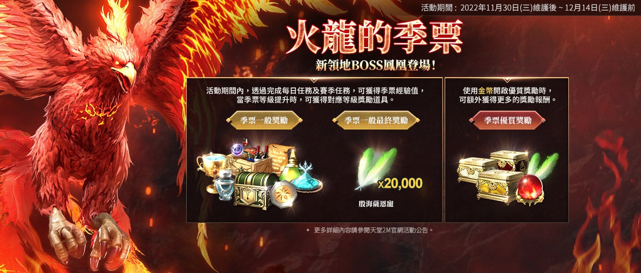 「火龍的痕跡」將無法進行隨機傳送;「火龍巢穴」則是無法進行隨機傳送以及使用根據地與一般返回卷軸,並將隨機出現首領「鳳凰」,「鳳凰」重生時間為 24 小時,擊敗首領有機會獲得包含「魔劍祕術書(雙次追擊)、二刀流祕傳(裂斬)、大劍傳術書(漠視)、弓術教材(慣性)、弩弓訓練書(消散)、弩弓訓練書(沉著直指)」等主要獎勵。