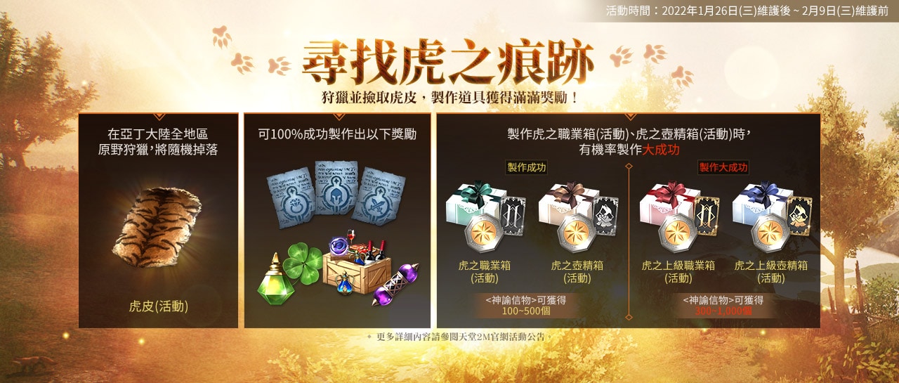 NCSOFT 旗下手遊《天堂 2M》更新新增狂暴化首領,並追加「黑虎」、「白牛」新壺精,同時展開春節慶典活動,更加強大的 BOSS 現身於亞丁世界。螞蟻洞窟地下 3 層首領怪物「狂氣巨蟻女王」,主要掉落物品為「王朝戒指、弓術教材(能量保護盾)、傳說製作卷軸」;克魯瑪沼澤地首領怪物「狂氣克魯瑪」,主要掉落物品為「天命戒指、大劍傳術書(漠視)、傳說製作卷軸」;克魯瑪高塔 7 樓首領怪物「狂氣核心基座」,主要掉落物品為「天使戒指、支配者權能、繼承者之書(推進 III)、二刀流秘傳書(裂斬)、傳說製作卷軸」;以及安塔瑞斯洞窟 6 層「狂氣猛龍獸」,主要掉落物品為「大魔法師項鍊、紅龍之弓、繼承者之書(高能藥劑 III)、魔道書(冰河風暴)、傳說製作卷軸」。