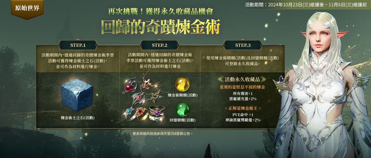 NC 旗下手遊《天堂 2M》更新,進行了原始世界雙斧職業更新與職業轉換。現有伺服器新增奧林匹亞副本「那芙琳仙境」,法利昂、林德拜爾與伊甸伺服器也分別推出全新內容。