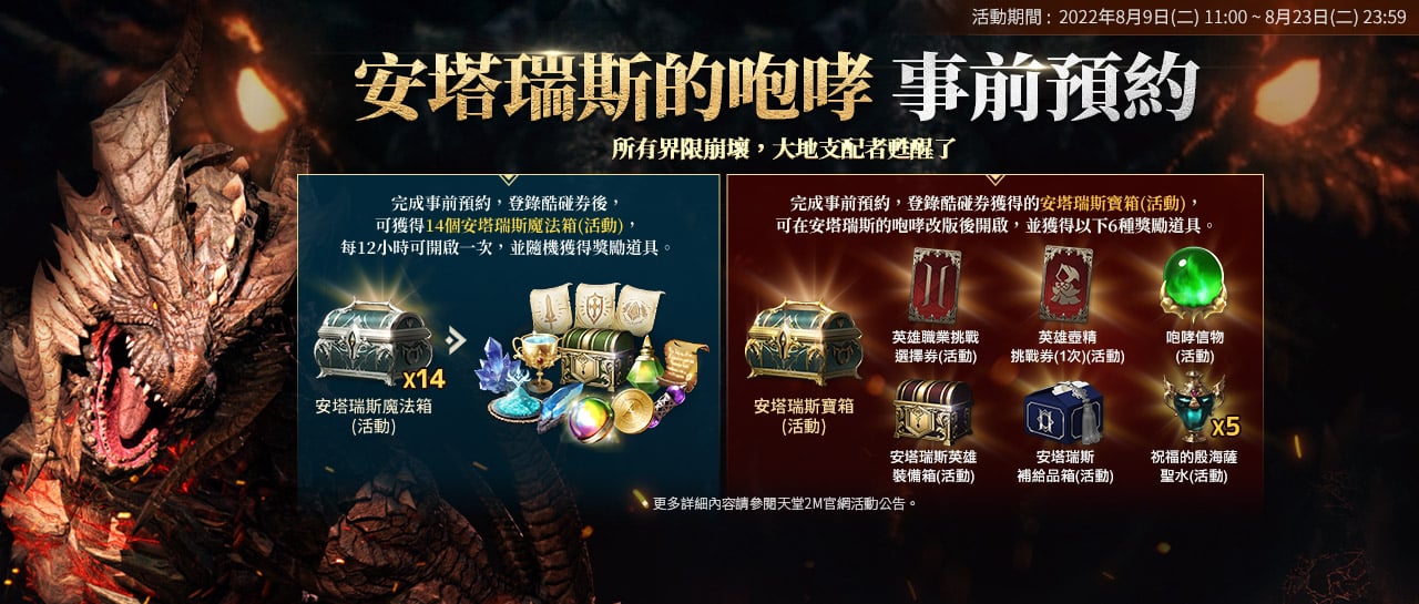 即日起至 8/23 23:59,只要參加《天堂 2M》「安塔瑞斯的咆哮」事前預約,即可獲得獎勵酷碰券,登錄後可獲得特別禮物,包含【英雄職業挑戰選擇券(活動)】、【英雄壺精挑戰券(1 次)(活動)】、【咆哮信物(活動)】、【安塔瑞斯英雄裝備箱(活動)】、【安塔瑞斯補給品箱(活動)】、【祝福的殷海薩聖水(活動)x5】以及【安塔瑞斯魔法箱(活動)x14】。