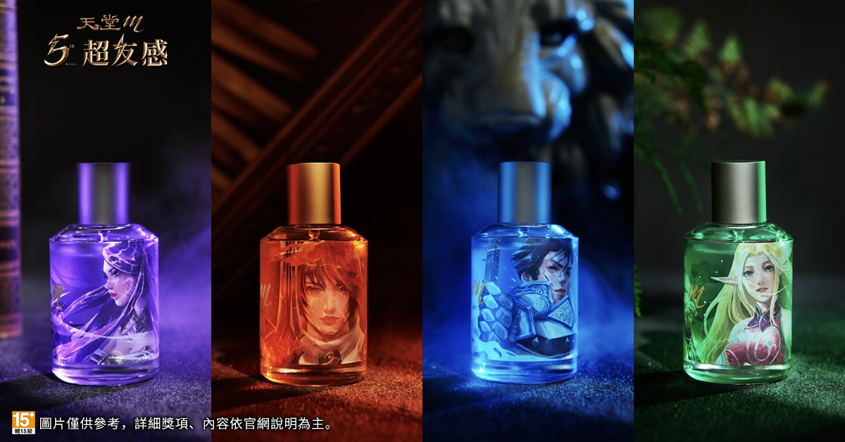 本次《天堂 M》「五週年超友感」贈禮為帶給專屬玩家精品級的尊榮質感,除香水本身調香外,在外包裝設計上也耗費許多心思,對於每個細節都不放過,嘗試各種不同加工工法的搭配,來回進行數十次打樣實驗,以及材質挑選層層把關, 最終以中世紀鍊金術繁複又有規律的符號作為基礎,設計出以四大職業角色為主題的四款瓶身,瓶身前後分別以角色和場景設計的透明瓶標圖案,藉由前後圖案讓香水瓶身設計更有層次感,也凸顯角色特色,更結合遊戲內容與專屬元素,賦予四大職業各自不同的設計。