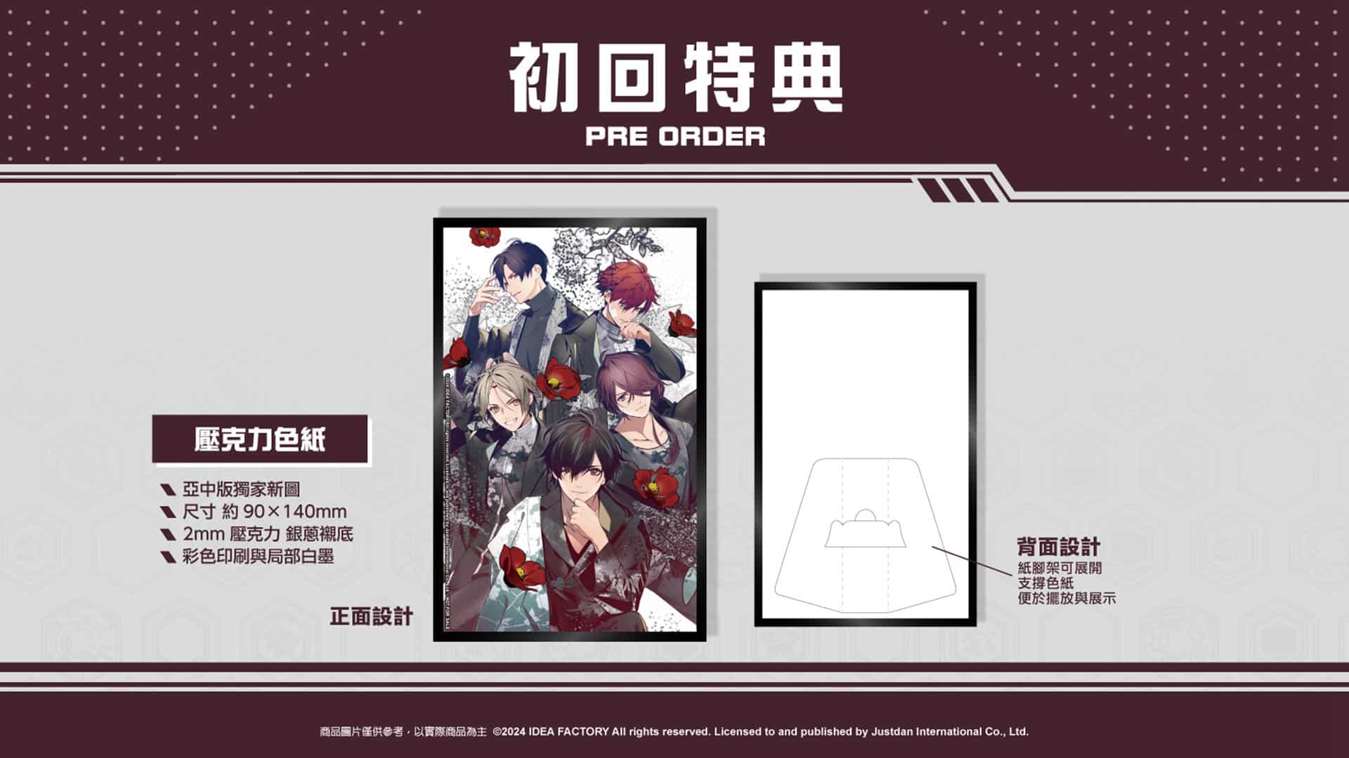 凡是預購首批遊戲的玩家,皆可獲得亞洲中文版獨家繪製新圖製成的壓克力色紙,五位男主角們將以全新的裝扮來到人間道與各位相見。本次亞洲中文加強限定版,除了日版「Otomate Sweet Box」收錄的特典小冊子、廣播劇、閻魔NOTE、拍立得風角色卡等內容並完整中文化外,更有亞洲中文版獨家繪製新圖製成的特製外盒、角色壓克力立牌以及新款 A5 海報卡。