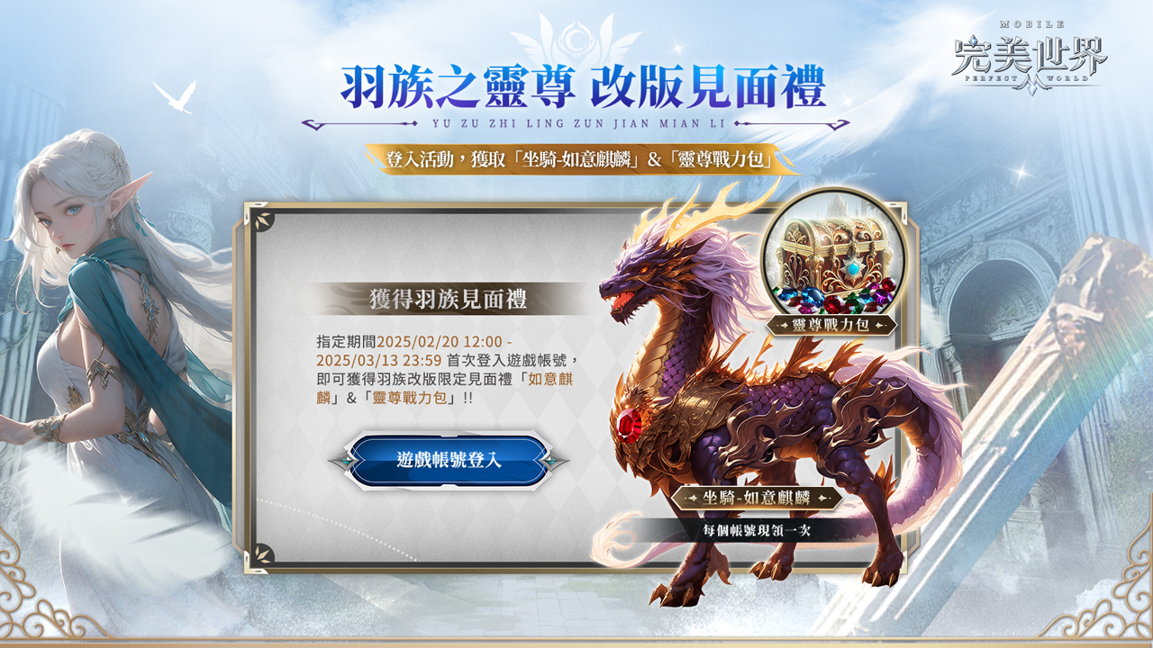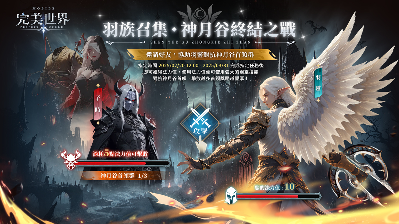 由艾玩天地所代理的 MMORPG 手遊《完美世界 M》,宣佈羽靈全新男角來襲,神月谷副本全新首領及新增詞綴同步上線。為歡慶本次改版,玩家只需到活動頁面完成網頁登錄即可獲得坐騎,如意麒麟及靈尊戰力包;參與網頁活動,羽族召集•神月谷終結之戰,擊敗首領還能額外獲得虛寶獎勵。