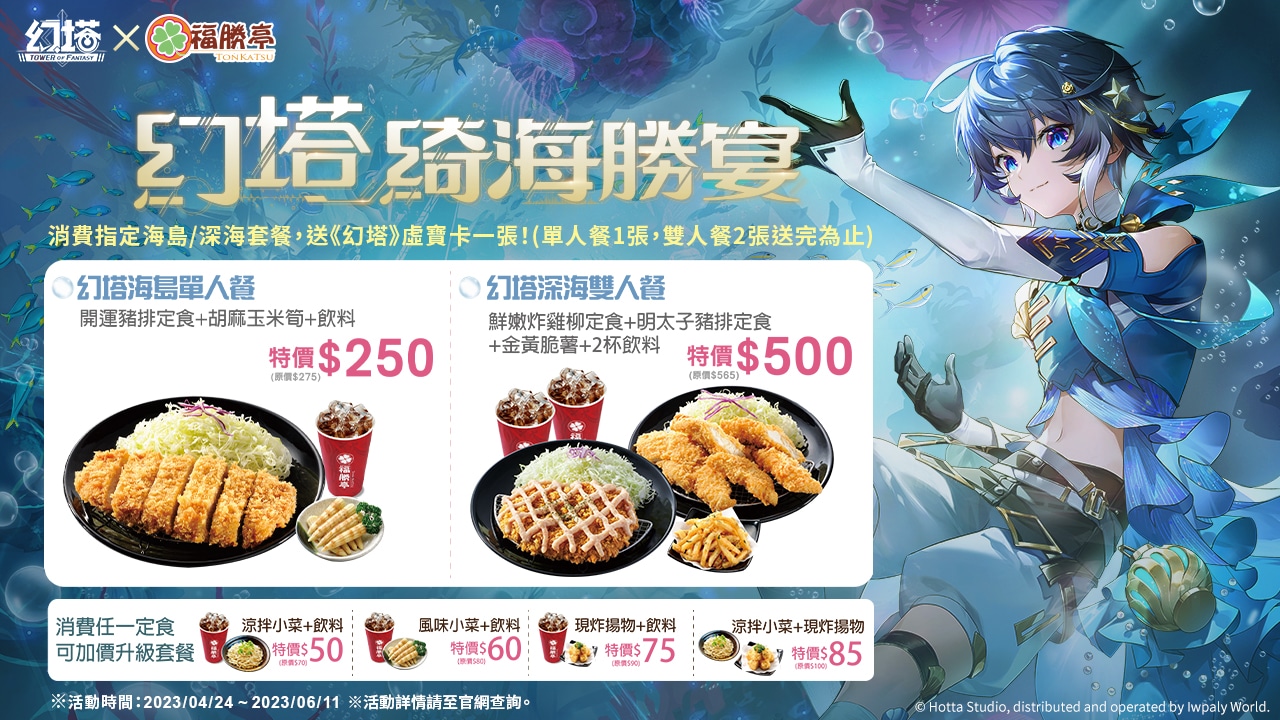 4 月 24 日至 6 月 11 日,拓荒者到全台福勝亭門市消費指定幻塔海島單人餐或幻塔深海雙人餐,即可獲得《幻塔》獨家虛寶卡,有機會獲得赤核、自選 SSR 源器碎片箱等虛寶獎勵。官方更加碼送出《幻塔》角色抱枕、玩偶,關注《幻塔》官方粉絲團,參加抽獎活動,把握機會把可愛的角色抱枕或玩偶帶回家。
