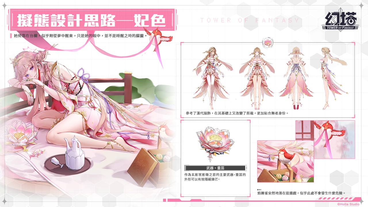 然而作為舞姬的妃色,卻不時現身於不符合她身份的場所,亦或與她身份懸殊的九域大人談笑風生。據傳,朱雀大人似乎也與妃色有著千絲萬縷且不為人知的關係,正如陽光背後總有陰影,在妃色這位絕美舞姬身上,還隱藏許多秘密等待拓荒者自行發掘。
