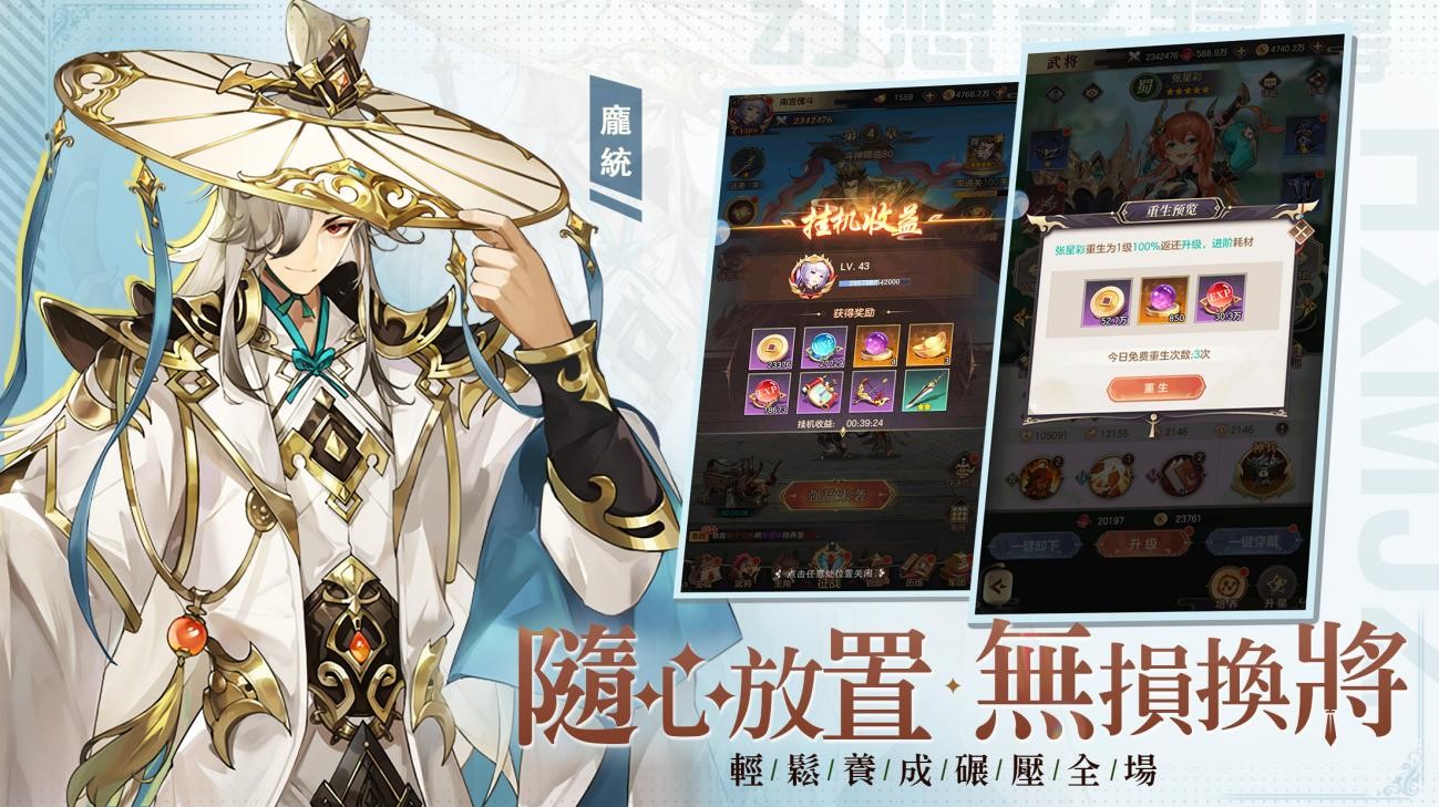 本作以「放置」為玩法核心,通過便捷的指尖微操和巧妙的武將搭配,即可輕鬆擊敗眾多強敵。戰梟雄、升官銜、收錦囊,魏蜀吳群陣容隨心配。而除了已知的預約里程碑獎勵以外,還能通過官方粉絲團參與抽獎活動,獲取更多禮物。為慶祝遊戲正式上線,官方還特別整理了開服六重禮,只要參與開服系列活動,免費 VIP 特權、400 連抽、4000 元寶、全套紅裝和多位六星武將均可輕鬆收入囊中。