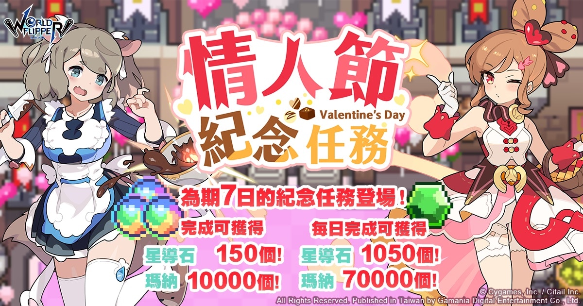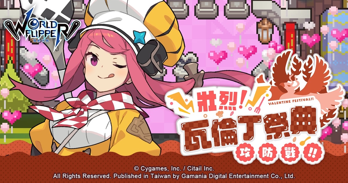 遊戲橘子代理、日本遊戲廠 Cygames 與子公司 ‎Citail 共同研發的彈珠台動作 RPG 手遊《彈射世界》於遊戲內推出情人節活動,【情人節登入活動】最多可獲得 350 個星導石、【情人節紀念任務】最多可獲得 1050 個星導石、70000 個瑪納、【新角色精選轉蛋】更新「情人節限定」,還有復刻劇情活動【壯烈!瓦倫丁祭典攻防戰!!】挑戰戰鬥任務,與限定角色 ★4「帕爾菲」成為夥伴。