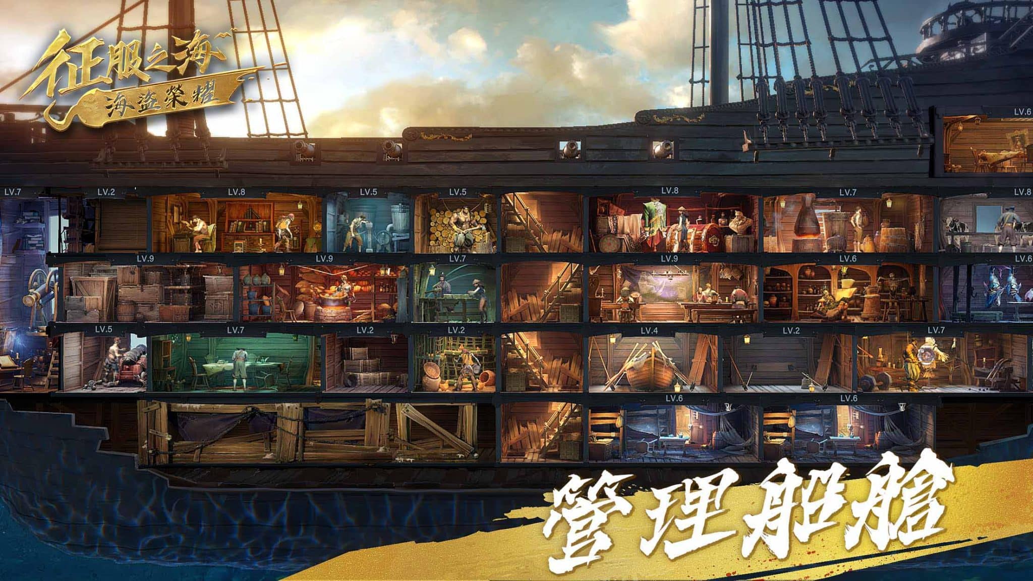 《征服之海:海盜榮耀》同時也結合了經營養成的部份,遊戲將主城發展與英雄養成結合在不同的船艙裡,玩家可以根據發展方向,自行決定如何運用船艙功能。