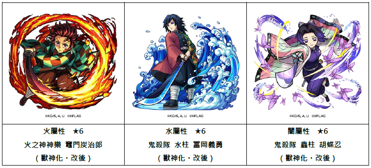 電視動畫《鬼滅之刃》的「煉獄杏壽郎」、「宇髓天元」、「竈門禰豆子」、「錆兔&真菰」、「栗花落香奈乎」期間限定於轉蛋中登場。其中,「煉獄杏壽郎」「宇髓天元」「竈門禰豆子」更可以獸神化。此外,突破合作活動冒險「機能回復訓練」可以蒐集「鬼殺隊硬幣」來交換「村田」「珠世&愈史郎」角色。購買「鬼滅之刃 合作活動新手禮包」還可以入手合作活動角色「我妻善逸&嘴平伊之助」。且在第一彈合作活動登場的熱門角色「竈門炭治郎」「冨岡義勇」「胡蝶忍」可以獸神化・改。