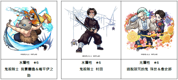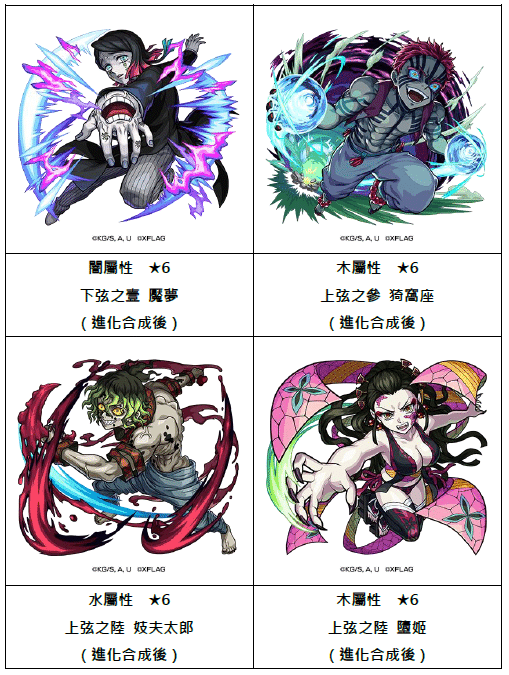 此外,鬼舞辻無慘麾下十二鬼月中,於「無限列車篇」登場的下弦之壹「魘夢」、上弦之參「猗窩座」;以及「遊郭篇」登場的上弦之陸「妓夫太郎」和「墮姬」等角色將於合作活動冒險中登場。第一彈合作活動的「竈門炭治郎」、「冨岡義勇」及「胡蝶忍」等人氣角色也將於轉蛋中再度登場。
