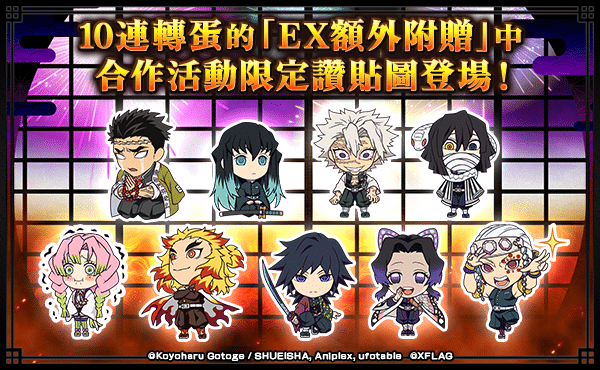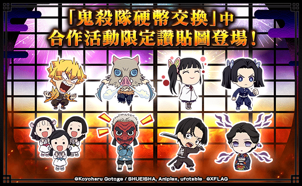 合作活動期間,以10連轉蛋抽轉蛋「鬼滅之刃」時,可從作為「EX 額外附贈」出現的「煉獄杏壽郎」、「宇髓天元」等 9 種柱的合作活動限定讚貼圖中隨機獲得 1 種。此外,於期間內登入可以獲得熱門角色「竈門炭治郎」、「竈門禰豆子」;突破合作活動冒險「機能回復訓練」後能獲得的「鬼殺隊硬幣」可用來交換「我妻善逸」、「嘴平伊之助」;根據在合作活動限定任務「無限列車任務」中達成的索敵進度可以獲得「千壽郎」、「魘夢」等各種角色的合作活動限定讚貼圖。