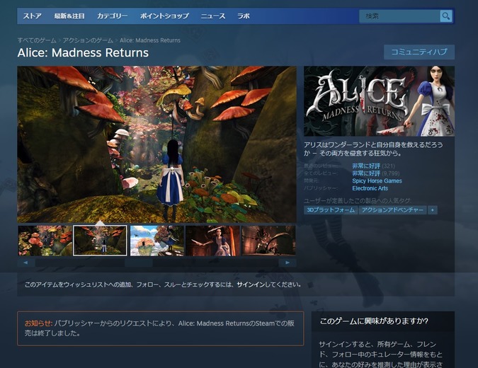 透過以《愛麗絲》為名的相關童話改編,打造出驚悚又有獨特風格的動作解謎的《愛麗絲驚魂記》系列第二作《愛麗絲驚魂記︰瘋狂再臨》,雖然其 Steam 版在 2016 年一度中止公開,但是 2022 年 3 月重新公開,讓粉絲又有機會可以入手這款遊戲。但在近期,卻在沒有任何官方通知的情況下,突然再次中止公開。