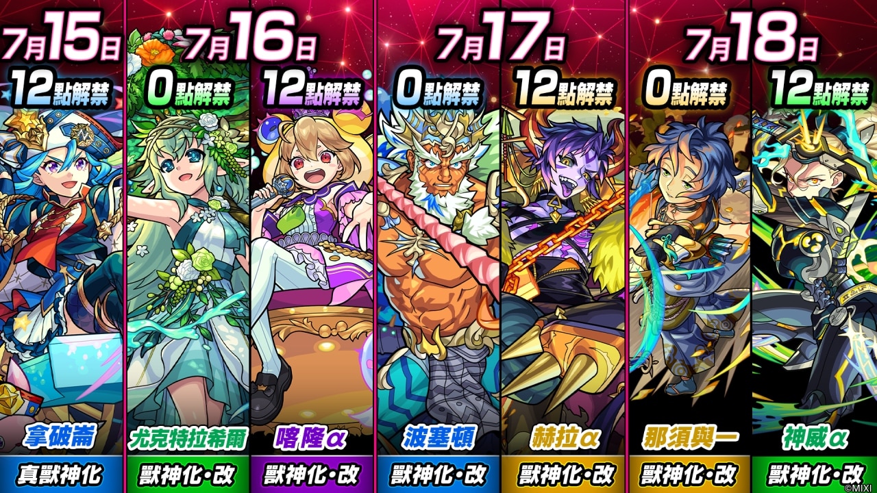 瑪娜「獸神化・改」正式解禁,她擁有「團結人心的慈愛天使 瑪娜」與「守護羈絆的慈愛解放者 瑪娜・阿尼瑪」兩種不同的「獸神化・改」形態,而且她過去推出的2個不同期間限定版本角色,這次也會一同換上新姿態。此外,7/16 ~ 10/1 舉辦「超爆轟黎擊破任務」,完成所有任務最多可以獲得 10 個寶珠。