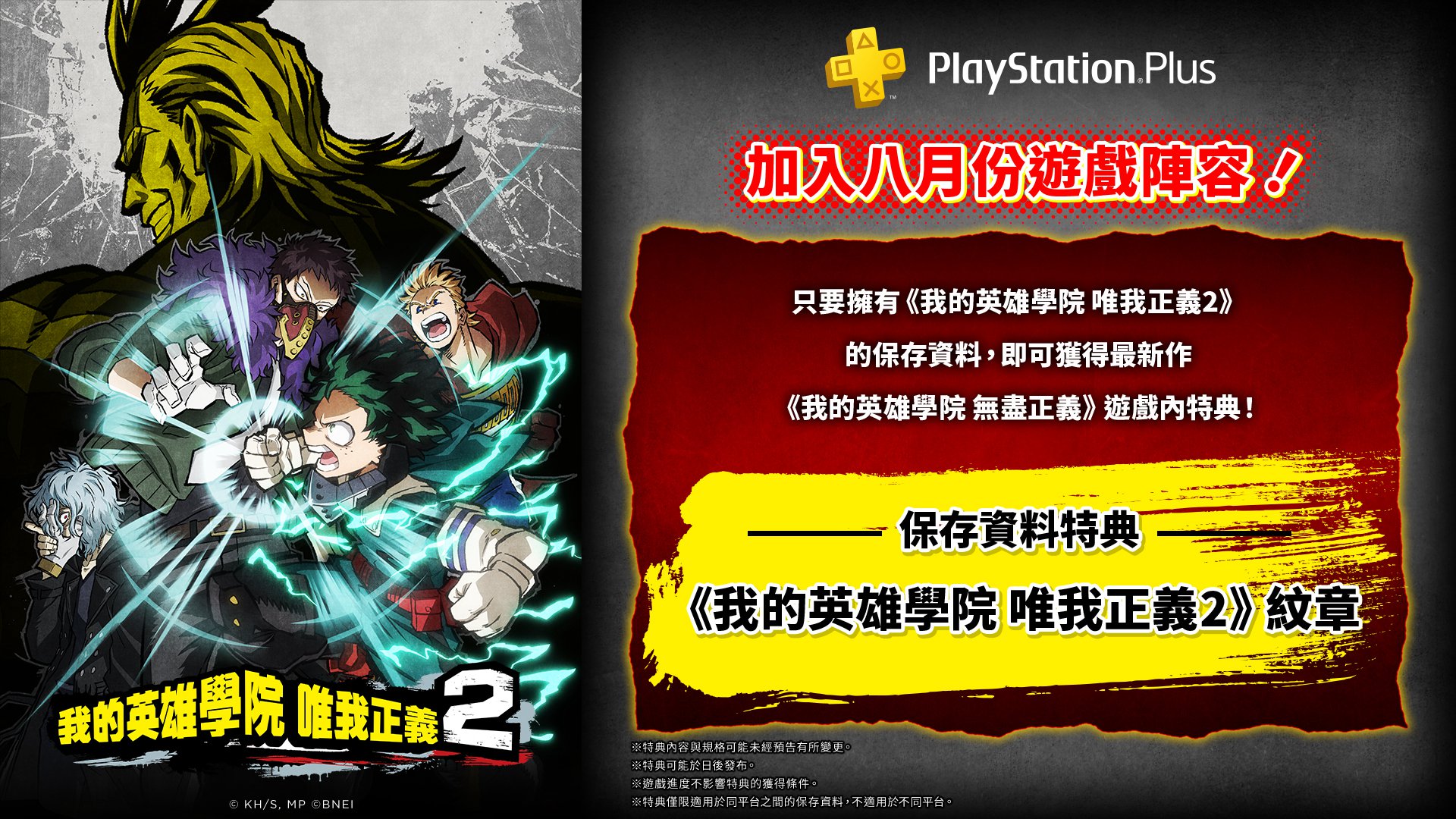 萬代南夢宮娛樂宣布,為紀念《我的英雄學院》家用主機遊戲最新作品《我的英雄學院 無盡正義》即將登場,《我的英雄學院 唯我正義 2》即將加入 PlayStation Plus 的 8 月免費遊玩陣容,並同步公開可與新作連動的保存資料特典情報。