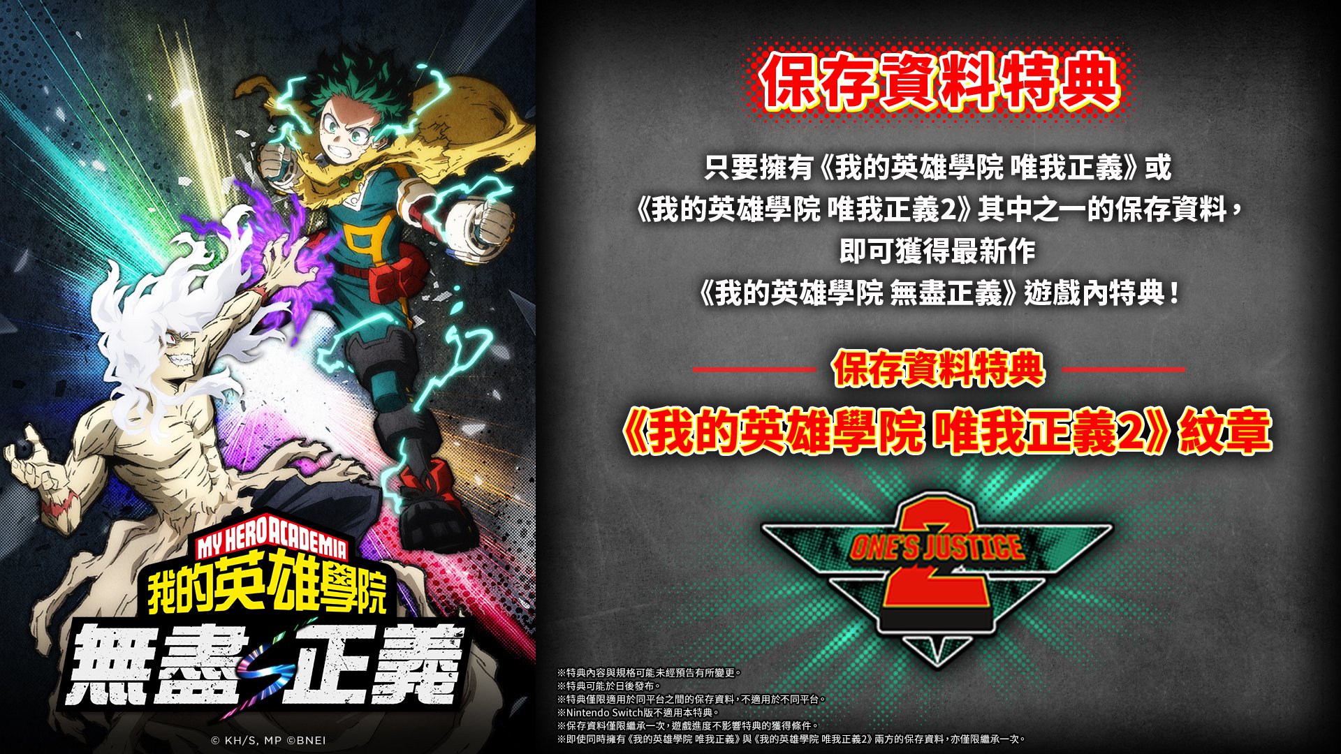 擁有《我的英雄學院 唯我正義》或《我的英雄學院 唯我正義 2》遊戲保存資料的玩家,將可在《我的英雄學院 無盡正義》中獲得能夠使用於自訂功能中的保存資料特典「《我的英雄學院 唯我正義 2》紋章」。