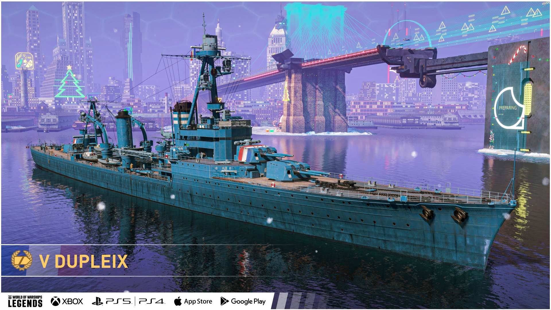 在最新版本中,玩家有一個獨一無二的機會前往未來,參觀 2125 年五光十射的紐約市,然後將戰艦停泊在港口。玩家會在商店找到來自未來的指揮官裝束和三艘新戰艦:裝塗著賽博龐克風表皮的義大利傳奇主力艦 R. Lauria 和蘇聯 VII 階加值巡洋艦 D. Pozharsky,還有法國 V 階加值巡洋艦 Dupleix。此外,即日起至2025年1 月 27 日,玩家只要完成為期四週的霓虹假期日曆的每日任務即可獲得獎勵,包括主要獎勵,2125 年紐約的超級巨星 Ultima Starlight 的指揮官裝束。