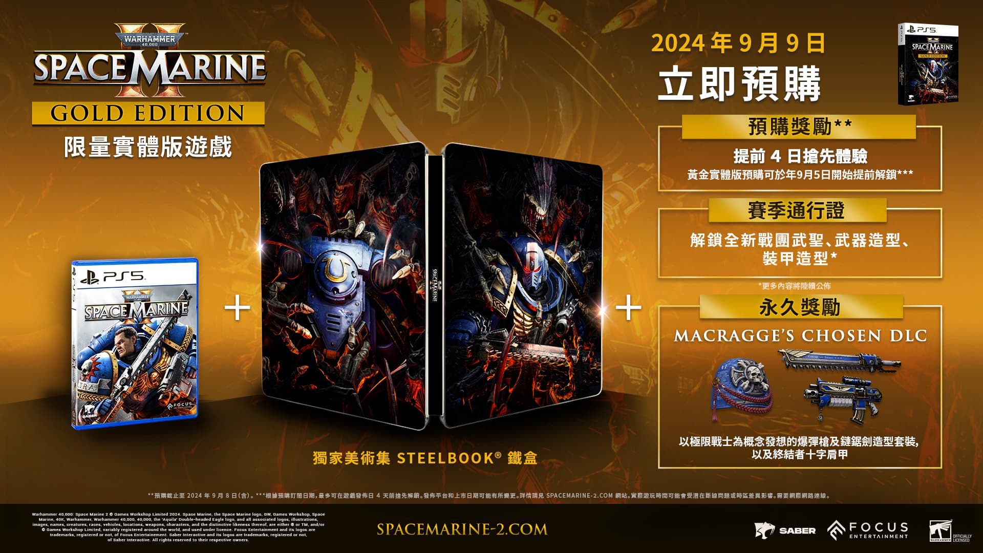 GSE 宣佈,由 Saber Interactive 開發,Focus Entertainment 發行的第三人稱射擊遊戲《戰鎚 40K:星際戰士 2》,一般版將於 2024 年 9 月 9 日、黃金版可搶先四天提前 2024 年 9 月 5 日推出。而 GSE 將擔任《戰錘 40K:星際戰士 2》的 PlayStation 5 中文實體版代理。