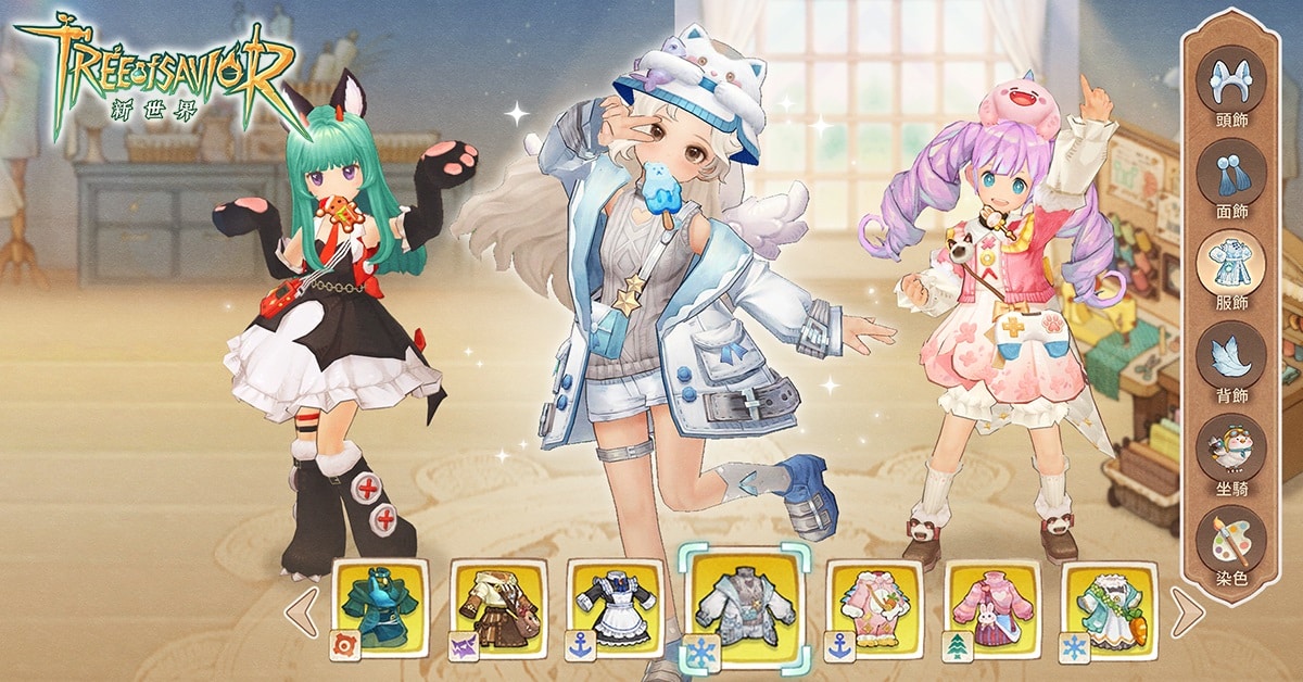 玩家能免費自製上百種永久且造型各異的金色時裝、金色坐騎和一系列可愛到爆的貓貓菇菇造型傢俱,時裝的多個部分都能分開自由染色。不但可愛,自製的時裝和坐騎也一樣有同等的戰力屬性加成。不管是材料還是染色劑,都可以通過學習以提升採集技術、縫紉技術,以及打鐵技術來免費自製。還有動作表情、寵物變身等一系列豐富的個性化養成系統。