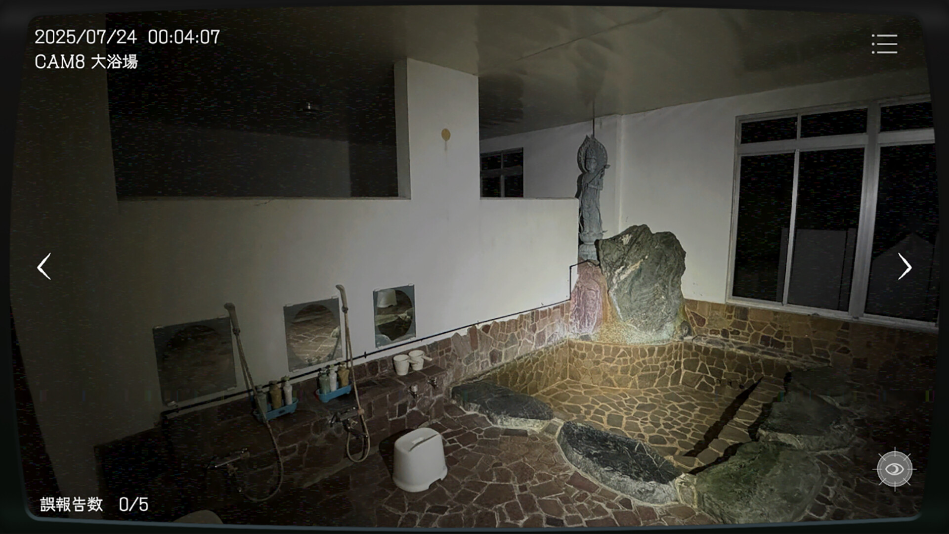 工作時間是 0 點到 5 點,發現異常就必須馬上向上報告,例如傢俱突然移動、消失,或者畫面出現雜訊等等,只要工作時間內都順利報告就能過關,相對的,要是判斷錯誤、沒有報告,就會被判定失職 Game Over。值得注意的是,本作中登場的凶宅,全是日本現實中存在的凶宅。
