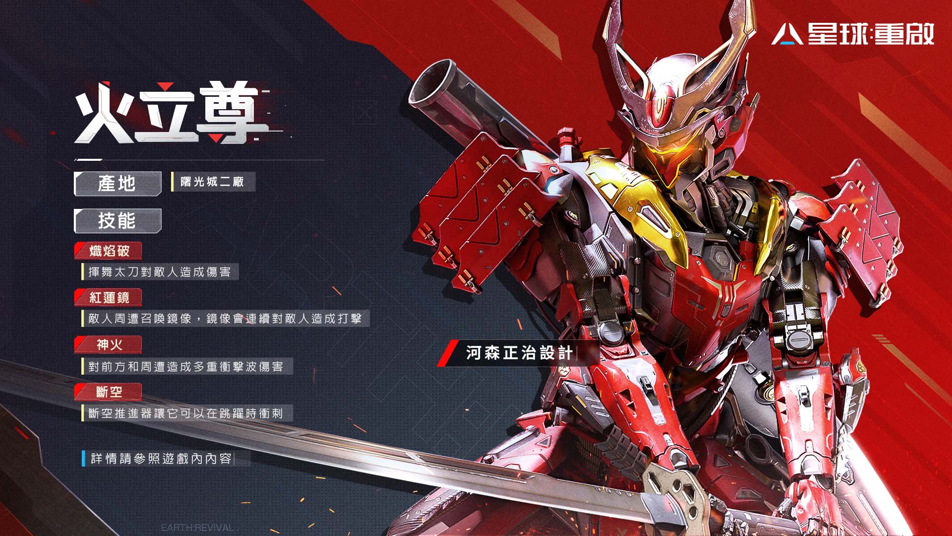 《星球:重啟》本次改版,將隆重推出全新戰甲「火立尊」以及全新武器「無聲嚎叫」,其中戰甲更是特別邀請日本機器人設計師河森正治參與設計。火立尊是聯盟曙光城二廠生產的機動型戰甲,以戰時特殊行動命名,標誌性武器是背部的巨型武士刀。武士刀攻擊時產生的衝擊波彌補了機動型戰甲攻擊距離短的不足。其機體設計賦予了火立尊一定穿透敵方防禦的能力,使其對付強防禦敵人時的攻擊效果出色。