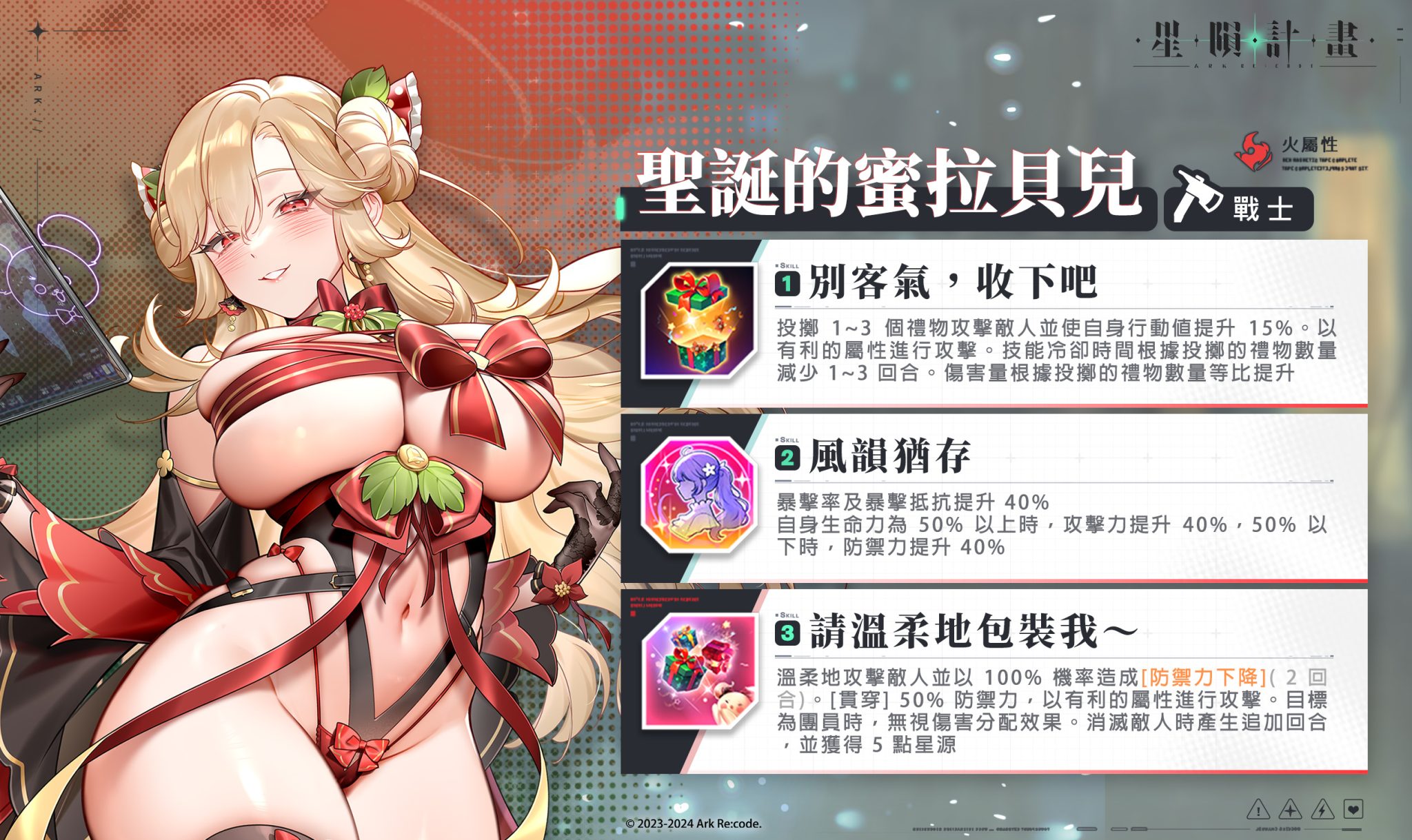 由 Neversoft 發行並於 EROLABS 平台推出的成人手遊《星隕計畫 Ark Re:Code》宣布,釋出新活動「妳的聖誕禮物」,以及新團員「聖誕的蜜拉貝兒」、新神秘團員「光明女神玳蓮」、新羈絆「寂寞的救贖」招募機率提升中。