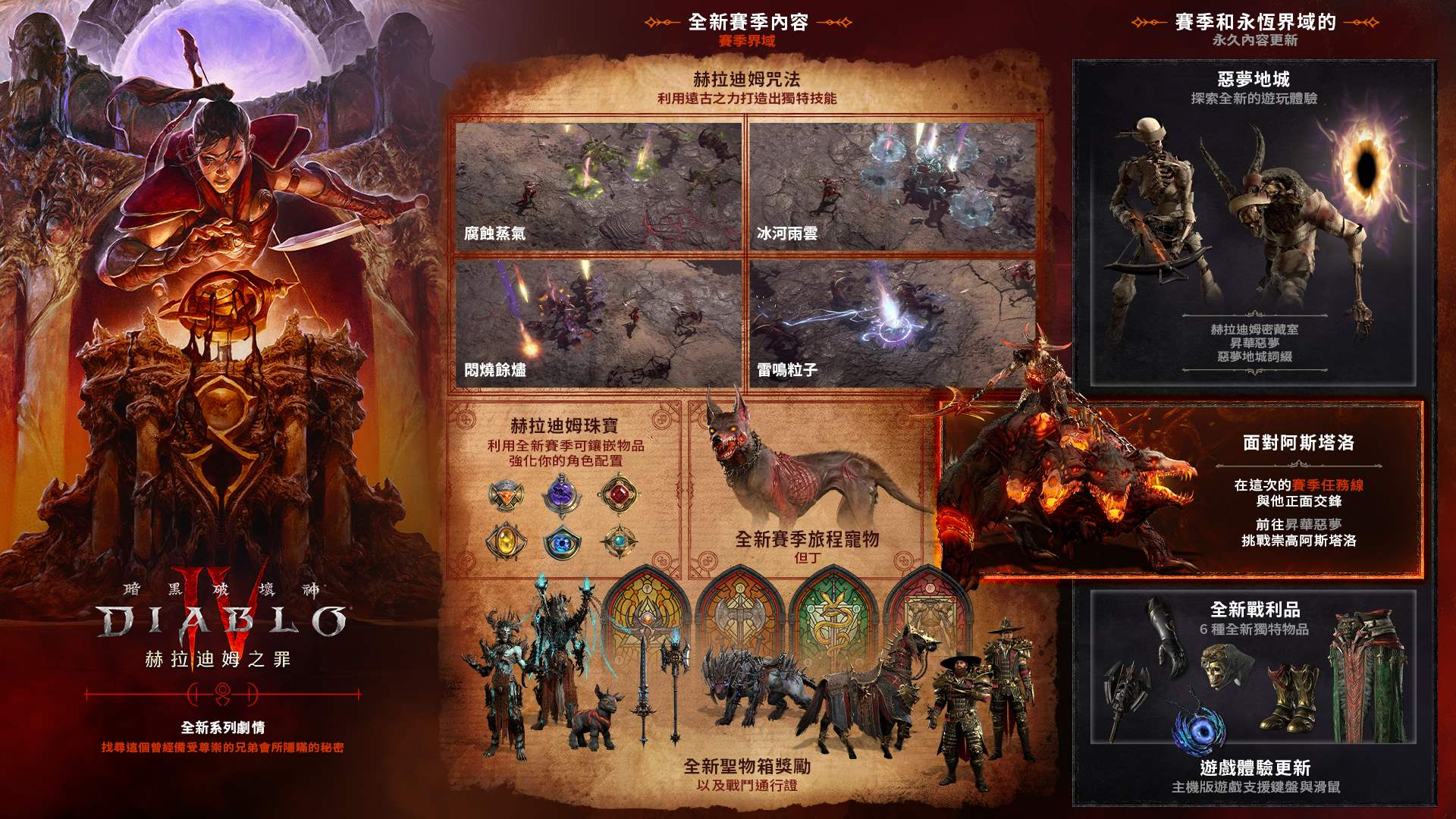 隨著《暗黑破壞神 IV》全新第 9 賽季「赫拉迪姆之罪」將於 7 月 2 日(三)上線,過往的秘辛也將隨之揭露。玩家將在賽季中,盡可能將受到焦炎公爵阿斯塔洛影響的惡血遺物全部淨化,研發強大的赫拉迪姆咒法,並在全新的遊戲終局事件中挑戰昇華惡夢,親自挑戰熟面孔與其惡魔戰騎。