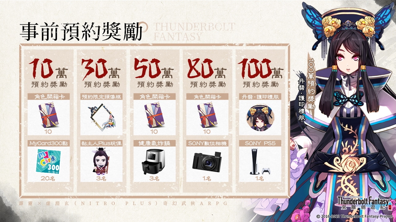 官方宣佈即日起開展事前登錄活動,玩家可前往事前登錄頁面進行預先註冊。達成指定預約人數後,不僅可以解鎖全服 30 連抽、預約限定頭像框和丹翡護印禮服,還能衝刺健康氣炸鍋、SONY 數位相機、SONY PS5 等實物大獎抽選,前往官方粉絲團參與活動即有機會獲取。