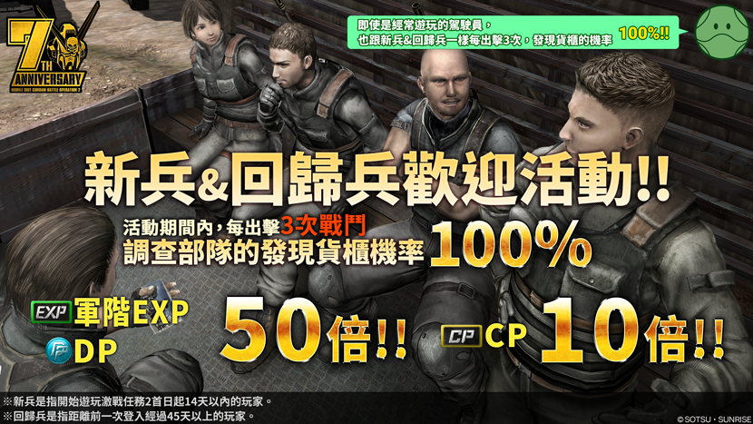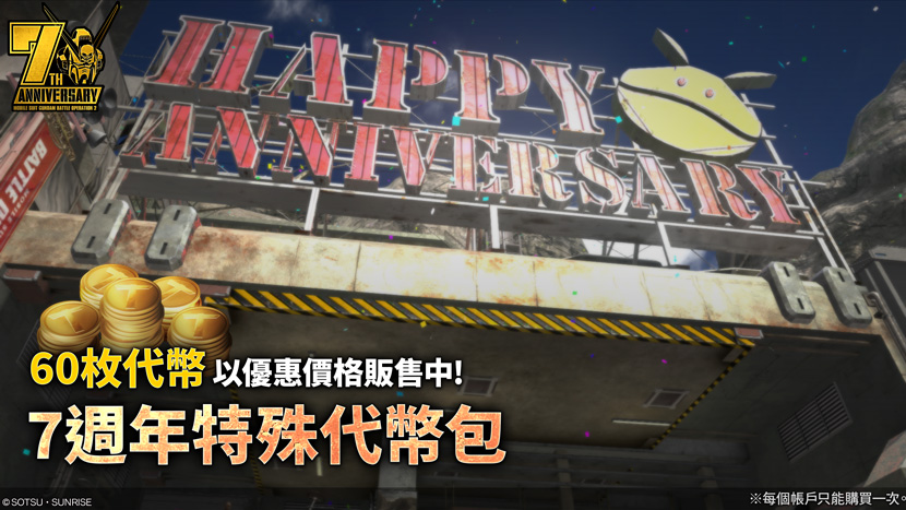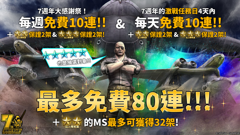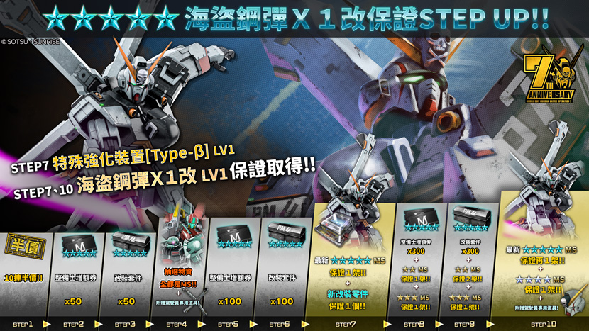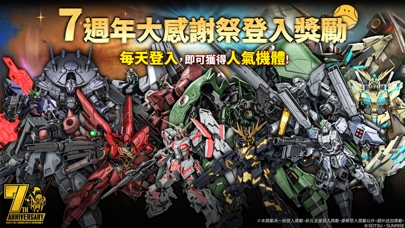 官方舉辦的「7 週年大感謝祭」活動,包括「海盜鋼彈 X1 改保證 STEP UP 抽選配給」、每次保證獲得 4 架 2 星以上機體與最多可進行 80 連免費抽選的特別抽選配給、贈送包含「感謝 39 代幣」、總計 50 架機體的 7 週年紀念貨櫃、可獲得 4 星機體如「獨角獸鋼彈 LV1」、「報喪女妖 LV1」等 7 週年大感謝祭登入獎勵、新兵與回歸兵的 EXP 和 DP 為 50 倍、CP 為 10 倍的「新兵&回歸兵歡迎活動」等。